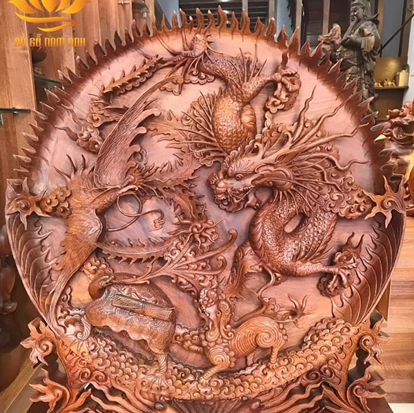 Đĩa tứ linh đục kênh bong gỗ hương liền tấm 90x70x7cm